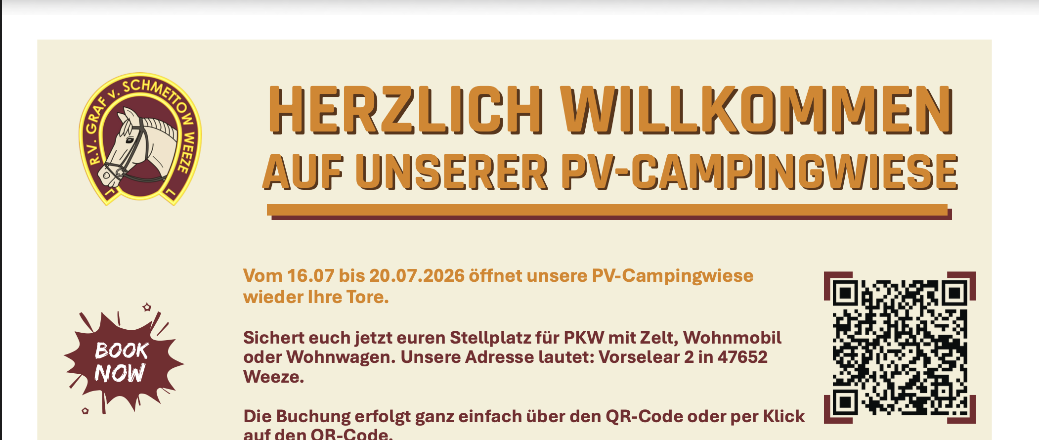 Vom 16.07 bis 20.07.2026 öffnet unsere PV-Campingwiese wieder Ihre Tore. Sichert euch jetzt euren Stellplatz für PKW mit Zelt, Wohnmobil oder Wohnwagen. Unsere Adresse lautet: Vorselear 2 in 47652 Weeze. Die Buchung erfolgt ganz einfach über den QR-Code oder per Klick auf den QR-Code. 50 € pro Nacht Für das Camping berechnen wir 50€ pro Nacht und Stellplatz. Die Campingkosten müssen vorab bezahlt werden. Der Stellplatz kann am Abreisetag bis 13 Uhr genutzt werden. In unserer Kantine vor Ort könnt ihr bequem bar oder mit Karte zahlen. Kein Grillen und kein offenes Feuer! Duschen und Toiletten sind rund um die Uhr für euch geöffnet. Sie werden einmal täglich gereinigt. Bitte entsorgt eure Chemietoiletten bei der ARAL- Tankstelle, Industriestr. 43, direkt an der B9 Richtung Kevelaer. Von Freitag bis Montag bieten wir von 10 bis 13 Uhr ein tolles Frühstücksbuffet an. Für das Frühstücksbuffet findet ca. eine Woche vor Anreise eine Bitte haltet die Wiese sauber und nutzt für eure Abfälle den bereit gestellten Müllcontainer. 15 € pro Person *Kinder bis 10 Jahre kostenlos. verbindliche Abfrage in der WhatsApp-Gruppe statt. Ihr habt Pfandflaschen- und Dosen, die ihr nicht mitnehmen möchtet? Werft dies gerne in den dafür bereit gestellten Behälter. Über den Erlös freut sich unsere Vereinsjugend